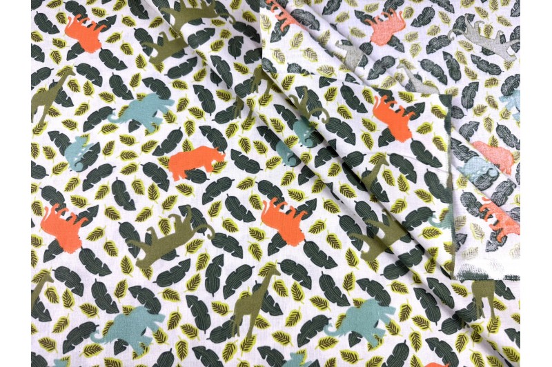 Coton imprimé motif animaux de la savane rhinocéros, éléphant et panthère fond vert sauge.