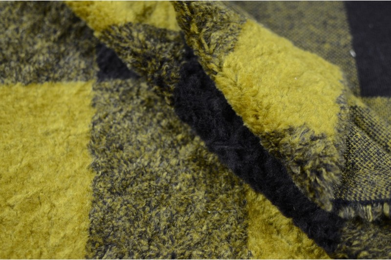 Tissu volumineux et très doux à carreaux tons marron, ocre, marron chiné ocre. Tissu dit "peluche" à poil mi - court.