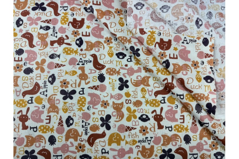 Coton fond écru Motif : poule, chat, cornet de glace… stylisés