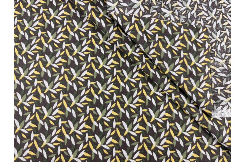 Coton fond marron kiki feuillage stylisé vert, écru, jaune.