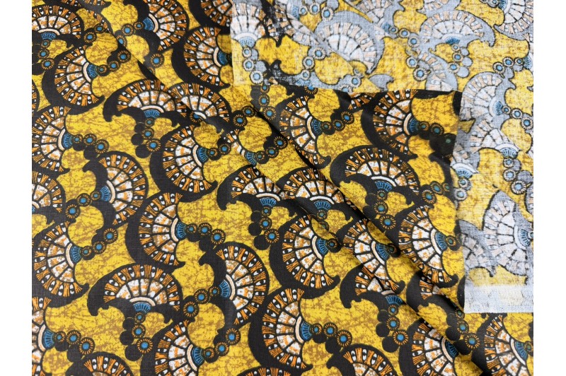 Cotonnade graphique fond moutarde imprimé marron, orangé, bleu.