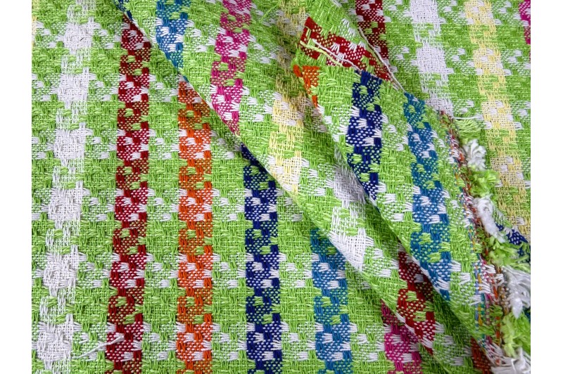 Ce tissu type Chanel vert, composé de 70% coton et 30% polyester avec un poids de 360 grammes au mètre, présente une texture riche et une structure tissée caractéristique, idéale pour des créations élégantes et structurées.