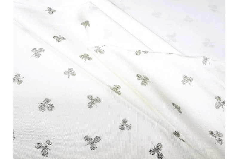 Illuminez vos tenues d’été avec ce joli jersey fond blanc cassé motif de trèfles gris lurex.