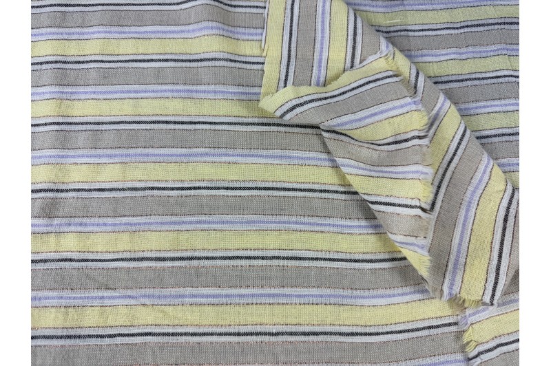 Apportez du caractère à vos créations avec ce joli lin mélangé à rayures beige, jaune, écru et une fine ligne mauve qui sublime le motif.