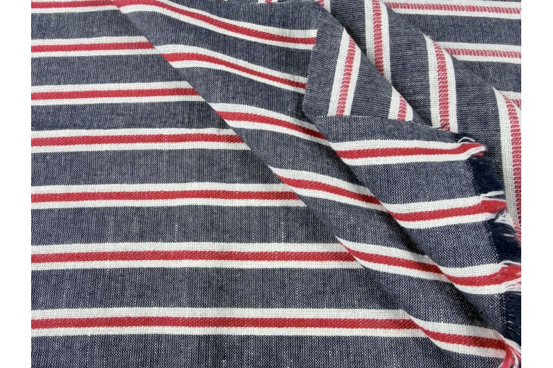 Apportez du style et de la fraîcheur à vos créations avec ce tissu rayé aux couleurs classiques bleu marine, blanc et rouge.